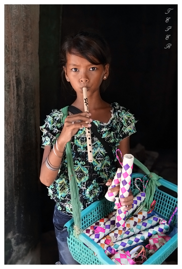 No time to waste, street vendors in Cambodia start young. This young lady is giving a demonstration of her products.